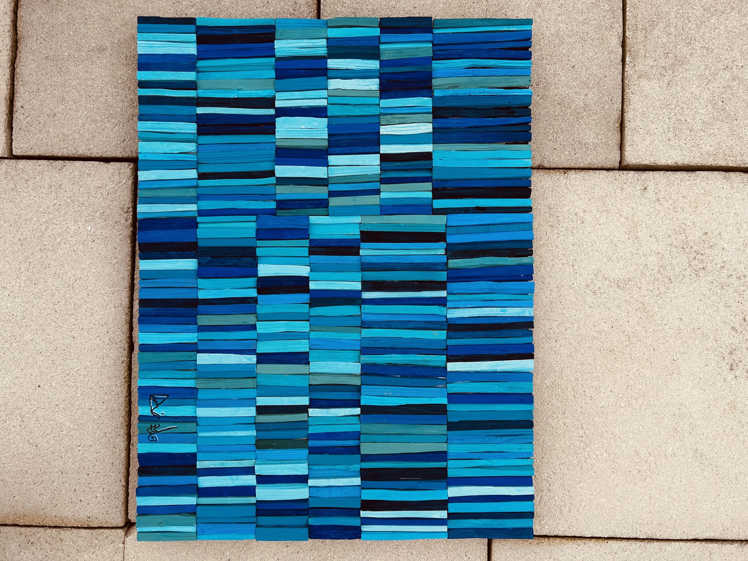 Oeuvre sur toile – Collage de centaines de petits bouts de bois allume-feu peints et assemblés subtilement.
